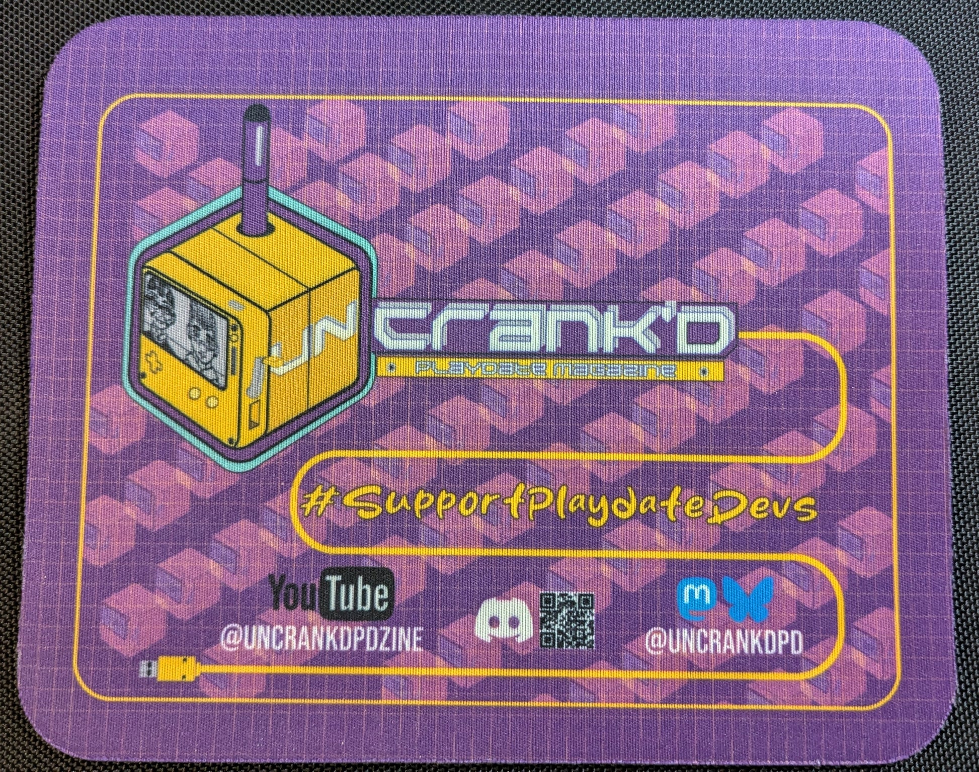 A small 7” x 9” (17.78 cm x 22.86 cm) of the Uncrank'd or the #Playdateprime mouse pads.